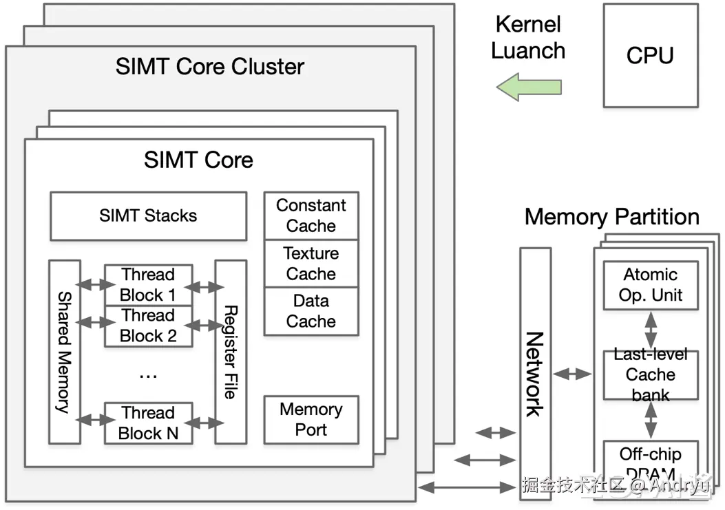 具体到 SIMT 的硬件结构,SIMT 提供一个多核系统(SIMT Core Cluster),CPU 负责将算子( Kernel)加载到 SIMT Core Cluster 中,每个 SIMT 核(SIMT Core)有独立的 RF(Register File)、ALU、Data Cache,但是只有一个指令计数寄存器(Program Counter)和一个指令译码寄存器,指令被同时广播给所有的 SIMT 核,从而执行具体的计算。GPU 则是由多个 SIMT Core Cluster 组成,每个 SIMT Core Cluster 由多个 SIMT Core 构成,SIMT Core 中有多个 Thread Block。