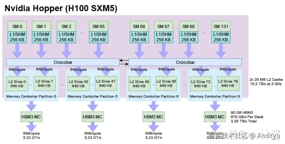 英伟达的 H100 由 132 个流式多处理器 (SM)组成,作为一个大型统一的 GPU 呈现给程序员。计算通过 CUDA 程序分发到具体的核心(Cuda Core/Tensor Core),每个执行核心有 SIMD 执行单元,从而实现并行计算。