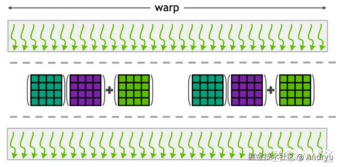 事实上,如果我们整体来看,如上图所示,一个 Tensor Core 是一个 4x4 的 Tensor Core 核心。但实际上,在一个 SM(Streaming Multiprocessor)中有多个 Tensor Core,我们无法对每个 Tensor Core 进行细粒度的控制,否则效率会很低。因此,一个 Warp 就扮演了重要角色,将多个 Tensor Core 打包在一起,以执行更大规模的计算任务。