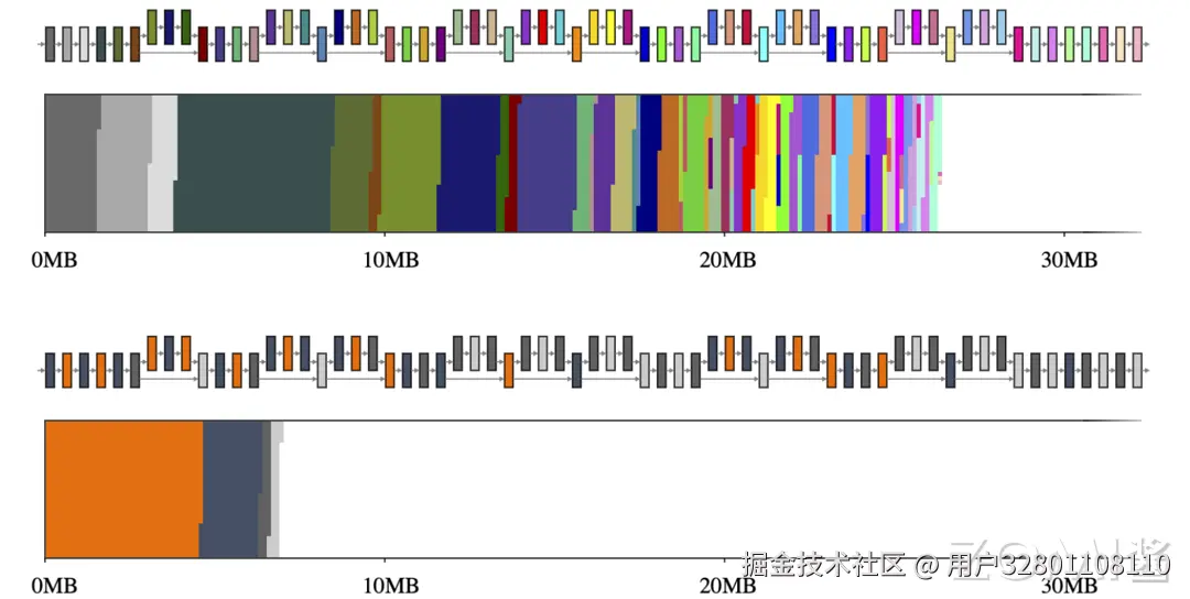最终可以看到在上图左下角为最终内存分配的方案,需要注意的是此处为预执行的操作而非模型真实运行中进行的内存分配,不同的颜色代表不同的内存分配的空间。