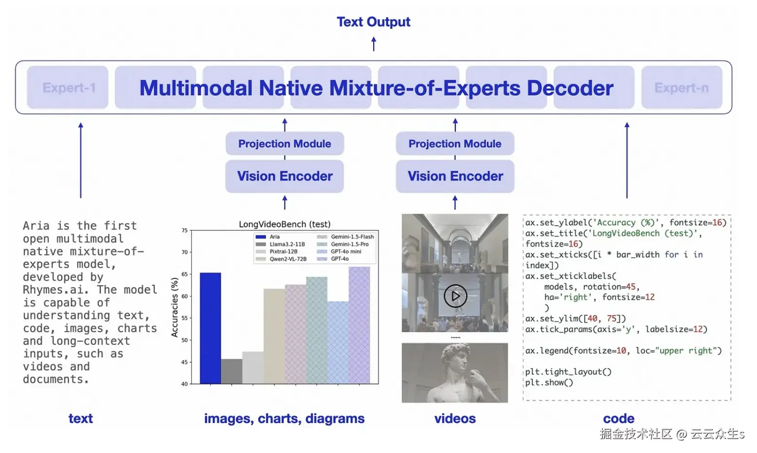 最近推出的Aria AI模型来自Rhymes AI,被誉为世界首个开源的多模态原生专家混合 (MoE) 模型,它可以在一个架构中处理文本、代码、图像和视频。