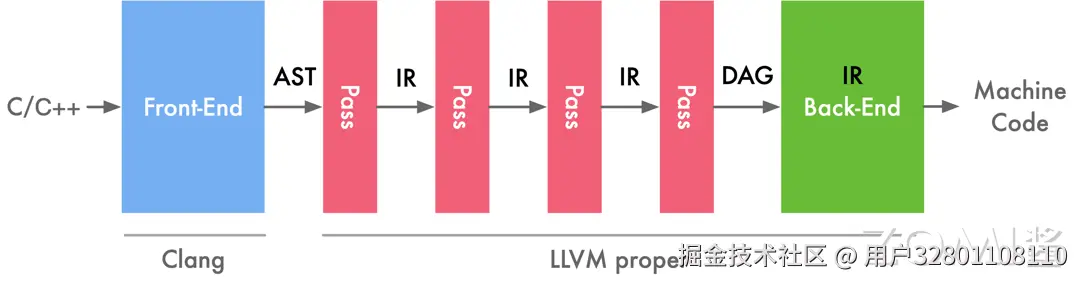 后端:将优化后的中间表示 IR 转换成目标机器的特定语言,确保代码能够在特定硬件上高效运行。