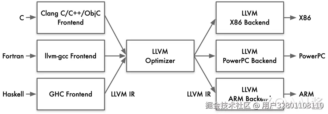 例如:LLVM 把前端和后端给拆分出来,在中间层明确定义一种抽象的语言,这个语言就叫做 IR。定义了 IR 以后,前端的任务就是负责最终生成 IR,优化器则是负责优化生成的 IR,而后端的任务就是把 IR 给转化成目标平台的语言。LLVM 的 IR 使用 LLVM assembly language 或称为 LLVM language 来实现 LLVM IR 的类型系统,就指的是 LLVM assembly language 中的类型系统。