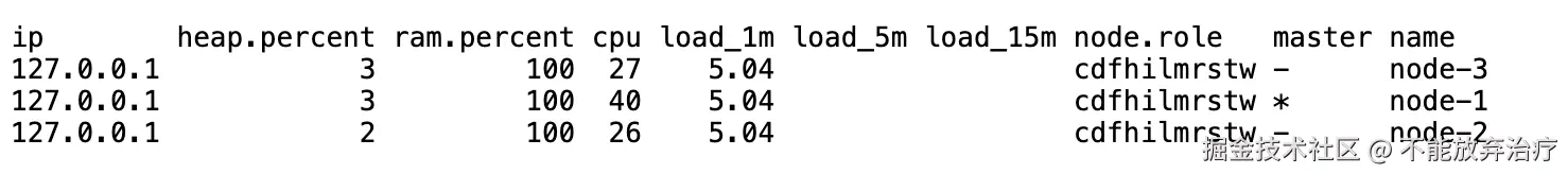 接下来,我们分别启动 3 个节点。启动完毕后。在浏览器输入 http://localhost:9201/_cat/nodes?v,如果看到 3 个节点,则表示本地 Debug 集群搭建完毕。