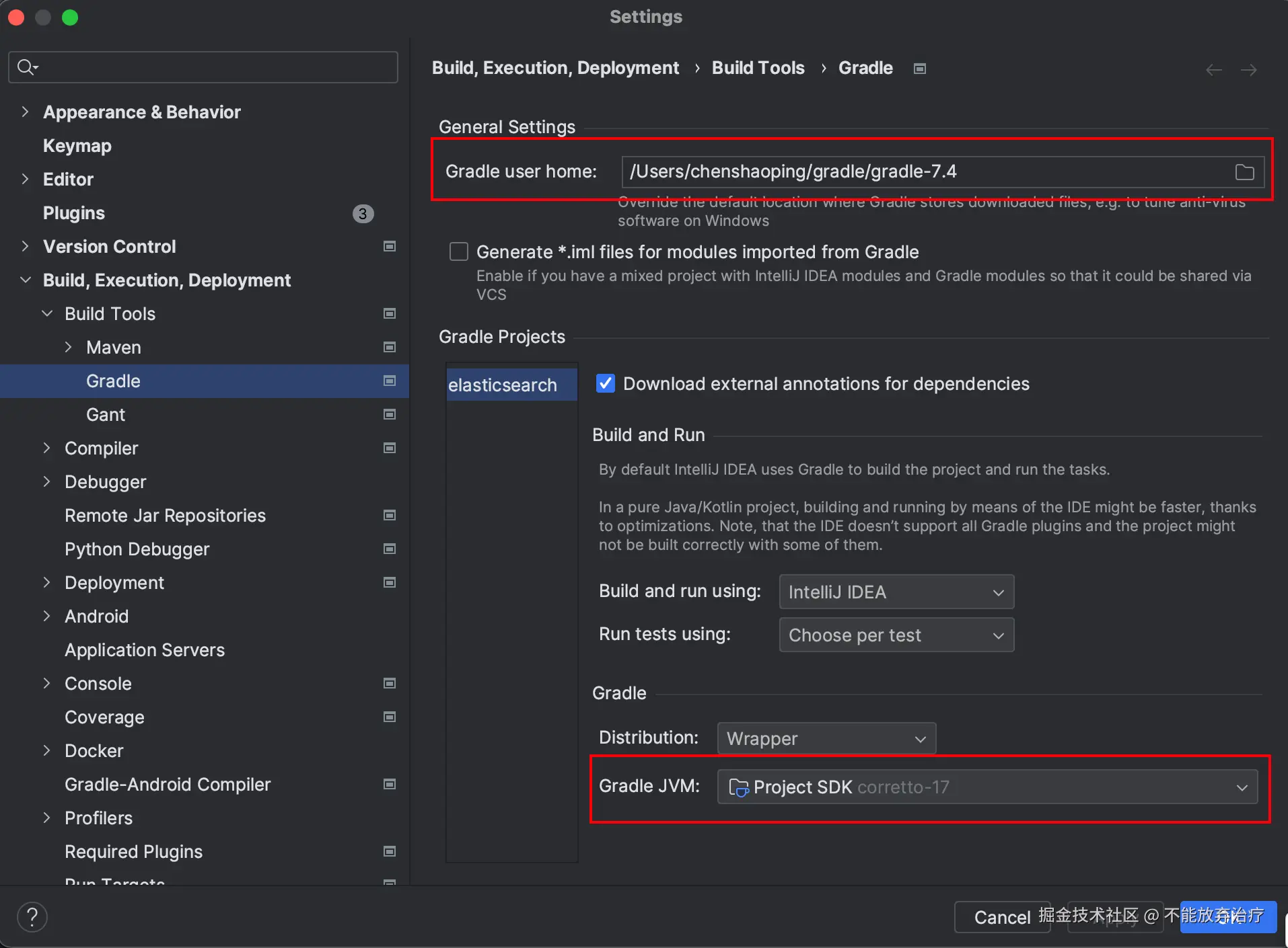 Gradle user home 是我们自定义的一个目录,该目录存储了与 Gradle 相关的用户级配置和缓存文件。gradle 下载的内容会被放到 Gradle user home 的 cache->modules-2->files-2.1。 我们可以在 Gradle user home 创建配置文件,对 gradle 进行配置。 笔者是直接将 gradle 的安装地址 /Users/chenshaoping/gradle/gradle-7.4 作为 Gradle user home