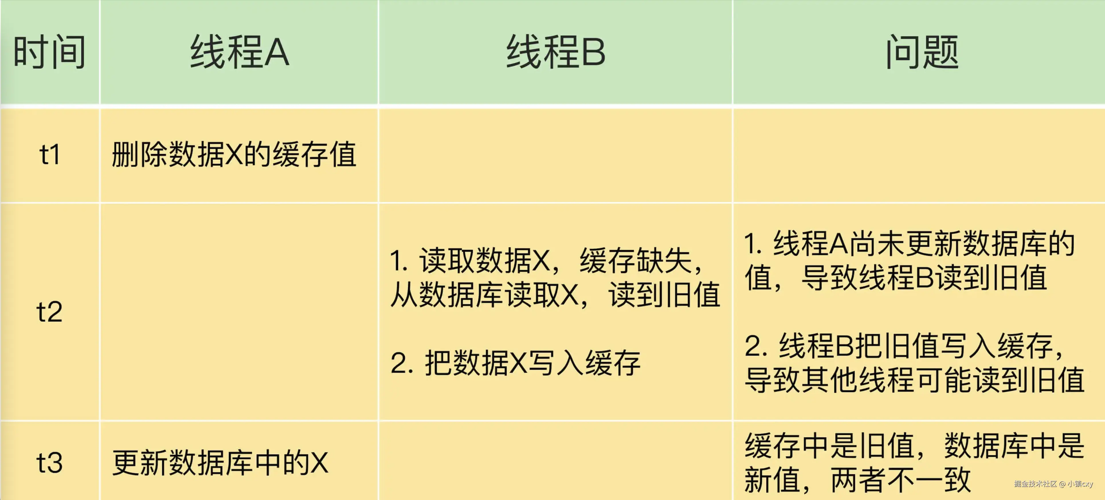 先删除缓存,再更新数据库 可能会出现的问题,假设线程 A 删除缓存值后,还没有来得及更新数据库(比如说有网络延迟),线程 B 就开始读取数据了,那么这个时候,线程 B 会发现缓存缺失,就只能去数据库读取。这会带来两个问题: a. 线程 B 读取到了旧值; b. 线程 B 是在缓存缺失的情况下读取的数据库,所以,它还会把旧值写入缓存,这可能会导致其他线程从缓存中读到旧值。