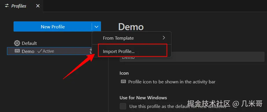 (Ctrl+Shift+P),输入“Profiles: Switch Profile”,可以选择目标Profile进行切换。 - 导出Profile:如下图,在Profiles编辑器中选择需要导出的目标Profile,点击“Export”,可以保存为本地文件或GitHub Gist。