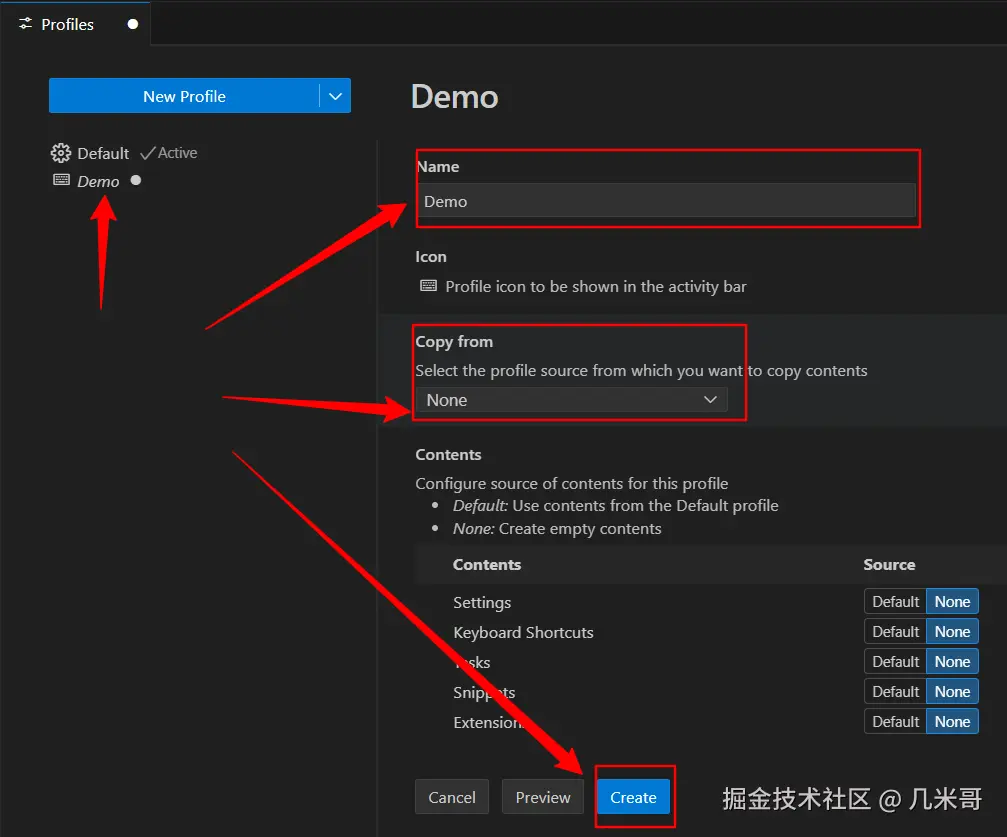 - 从“Copy From”中选择“None”。(我们先选择空白Profile,VS Code还提供不少预设的Profile模板,之后会用到)