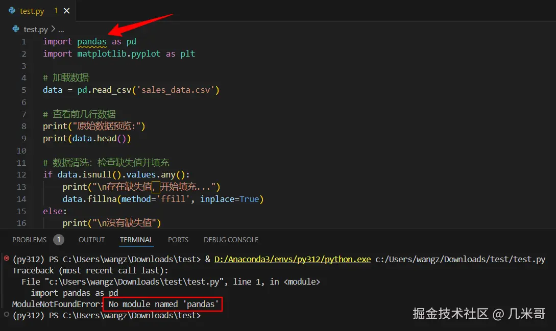 - Python库的问题:如果您想尝试其他一些网上下载下来的Python程序,要确保程序没有import额外的Python库,不然可能会出现Module没有安装的错误,比如我的py312环境里还没有安装pandas,下图显示这个程序就会运行出错,不过正是因为我们安装了这些Python Profile包含的扩展,它们会自动帮我们发现还没有安装的库,下图程序中的第一句