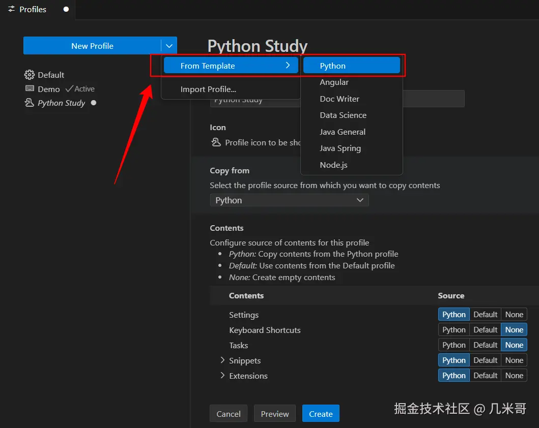 - 输入Profile名称(如“Python Study”),点击“Create”即可。