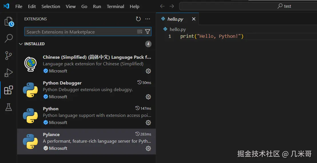 (Ctrl+Shift+P),输入“Profiles: Switch Profile”,选择“Python Study”。 - 创建一个Python文件(如下方的test.py),该代码是个简单的猜数字游戏,不需要安装任何额外的Python库,直接可以运行。
