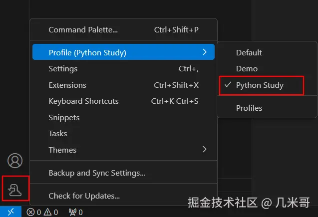- 如下图所示,点击VSCode左下角的Manage图标,切换到Python Study Profile,确保以下扩展已自动安装: