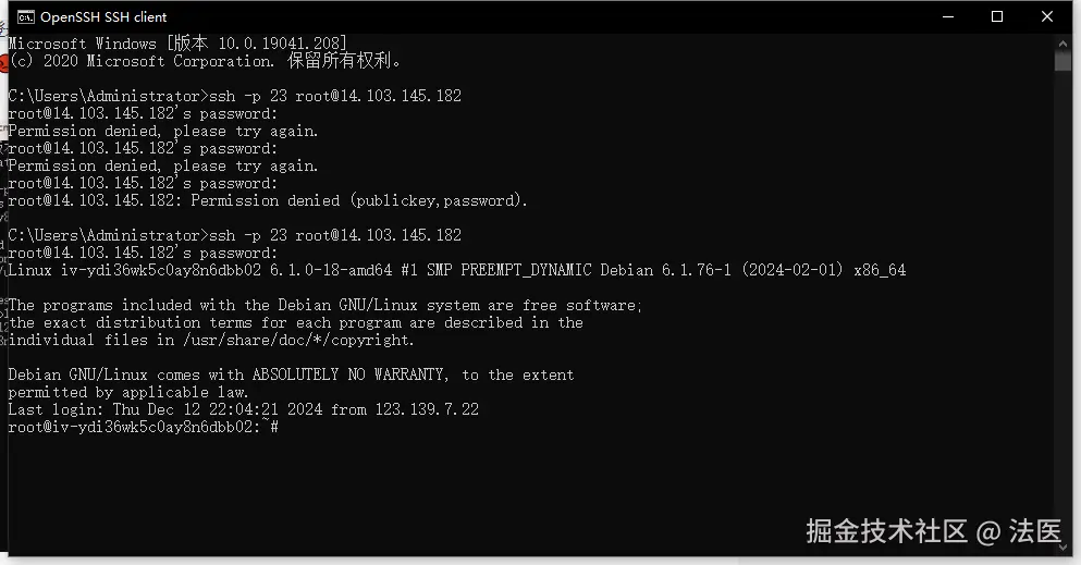 ssh -p 23 <提供的用户名>@<ECS服务器IP地址>