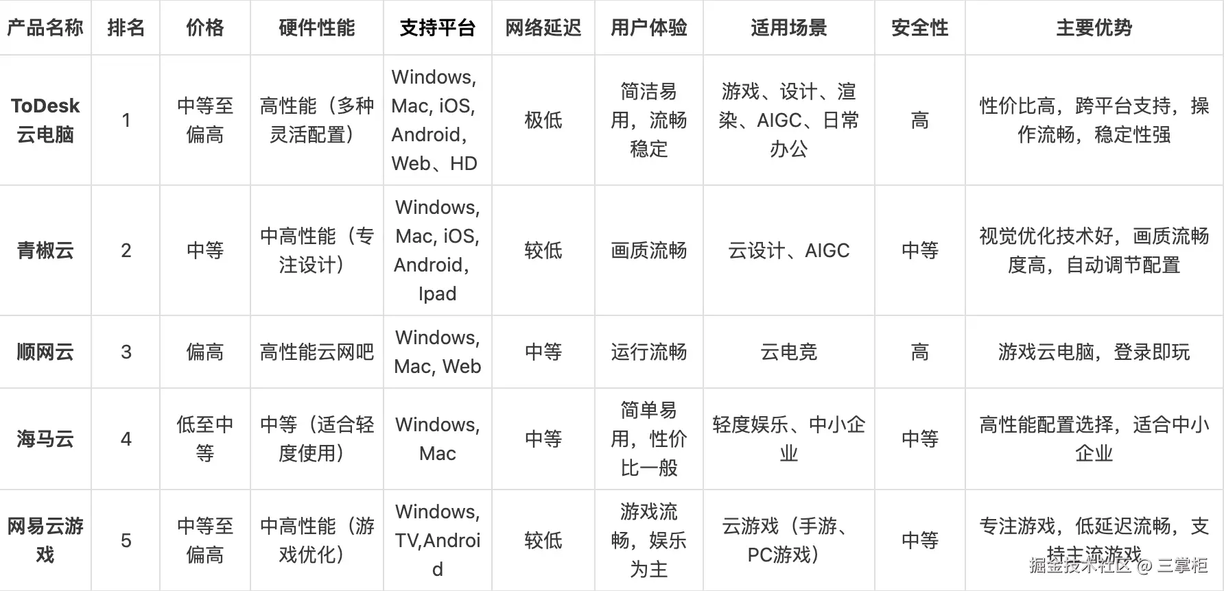 三.关于Top5云电脑产品多维度表格对比