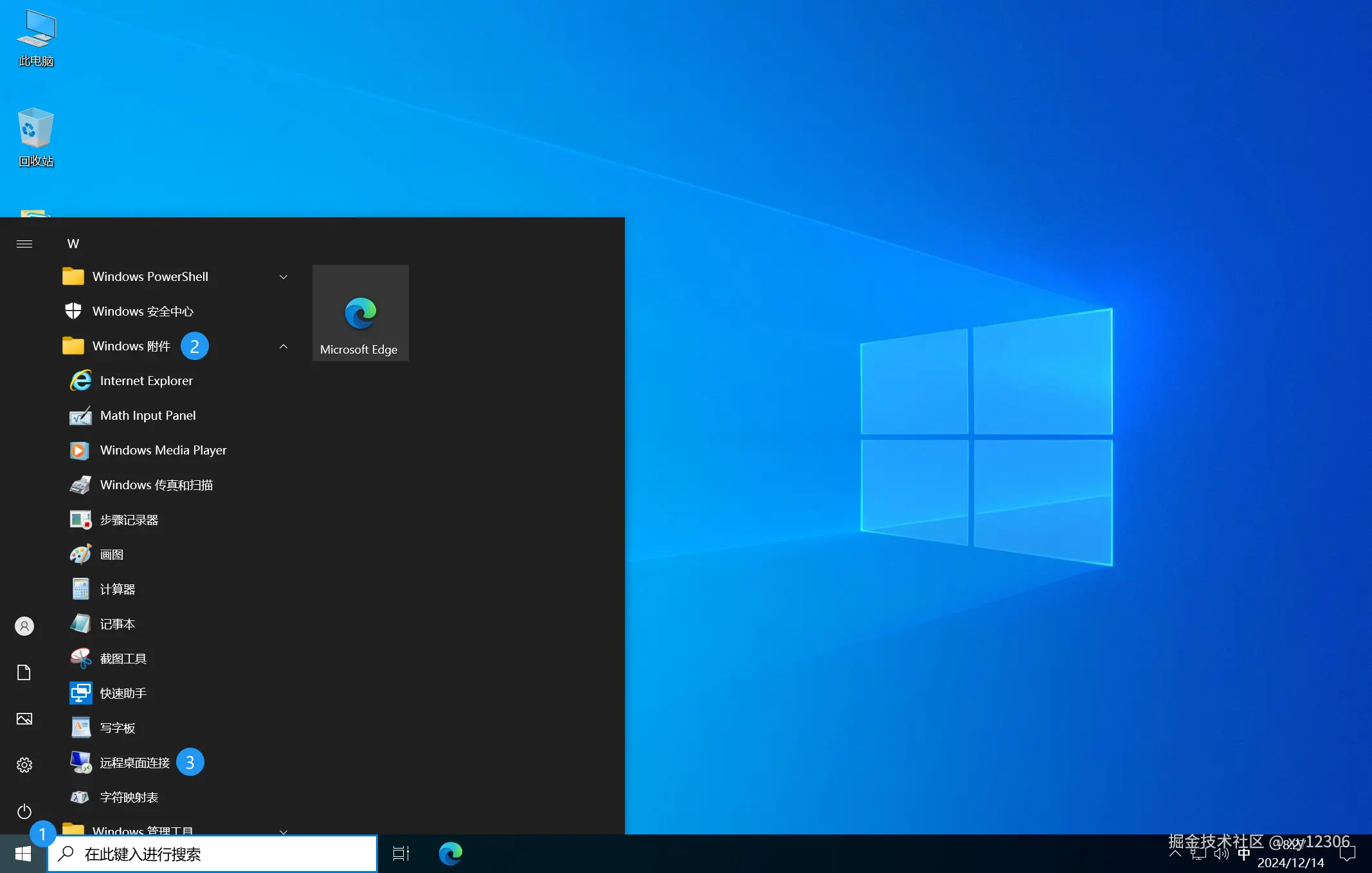 - 按照以下图片提示,打开 ”远程桌面连接“ 的窗口。