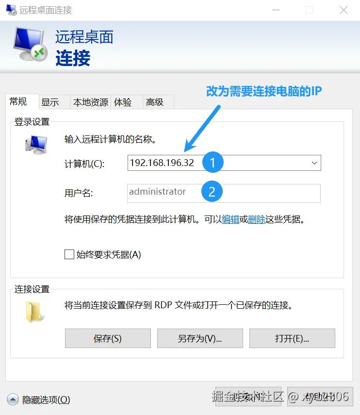 - 在 ”远程桌面连接“ 的窗口输入要连接电脑的IP 、用户名 (无密码的电脑用户请参考上面第2条)