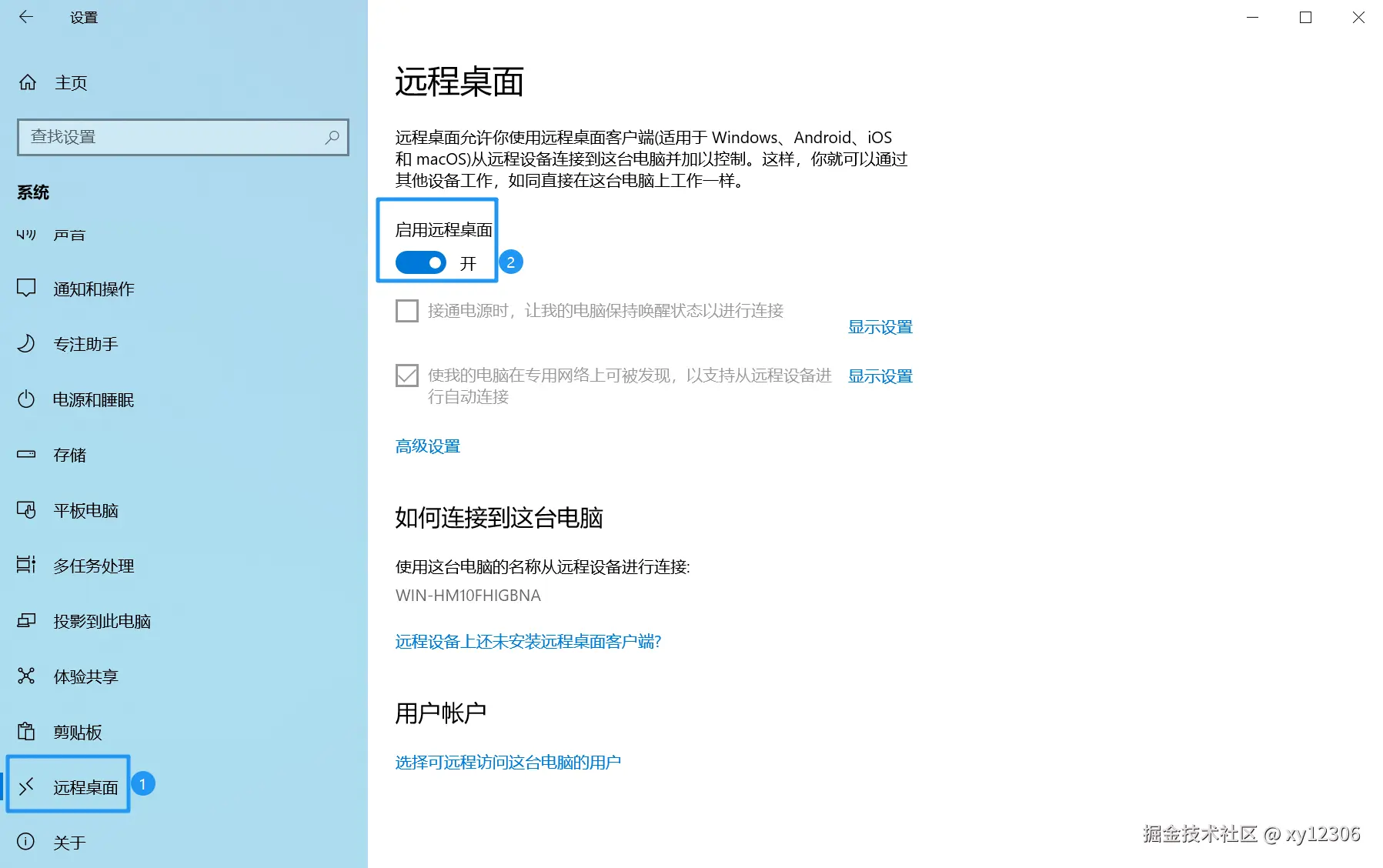 Win + I键打开Windows设置,然后选择 “系统” 。在窗口左侧选择 “远程桌面” ,接着单击开启 “启用远程桌面” 下的按钮。