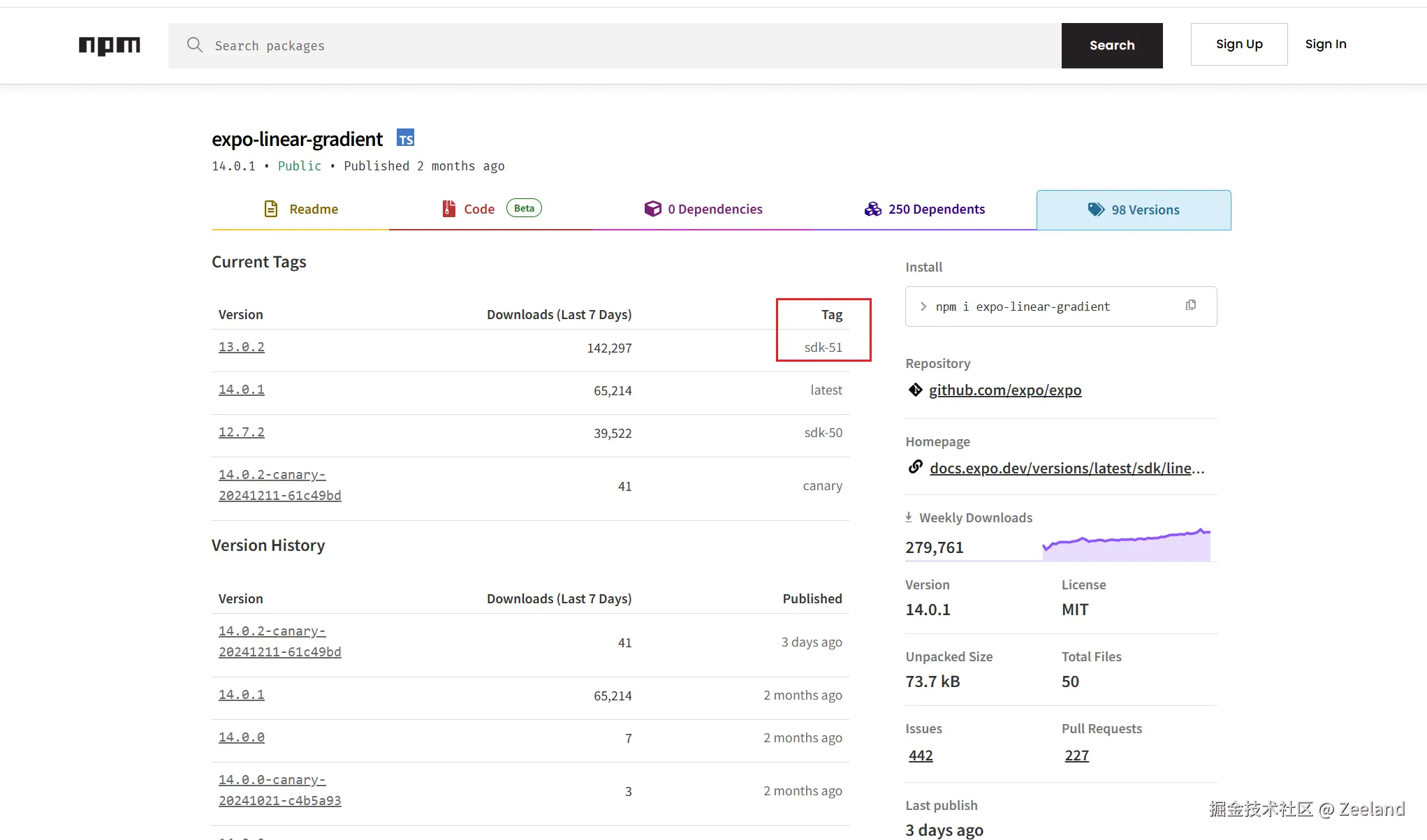ta 问了我这个问题,我直接去 npm 看了一下 ta 的包发行的对应的 expo (上游依赖)版本是多少,一下子就找到了 ta 应该使用的版本号,我猜到发行者肯定会打个 tag 来做标识。