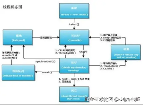 3) 其他阻塞:通过调用线程的 sleep()或 join()或发出了 I/O 请求时,线程会进入到阻塞状态。当 sleep()状态超时、join()等待线程终止或者超时、或者 I/O 处理完毕时,线程重新转入就绪状态。