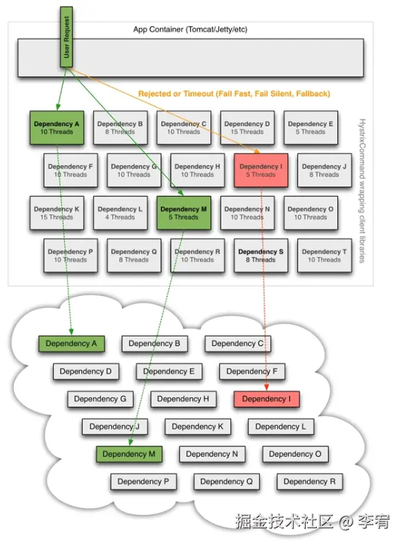 - **定义:**通过独立的线程池或信号量机制控制单个服务的最大连接数,避免某个服务的故障影响全局。
