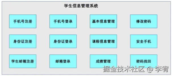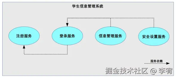 - 示例:学生信息管理系统中的注册服务、登录服务、信息管理服务、安全设置服务。