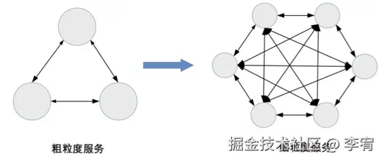 - 服务划分过细:服务间关系复杂,系统整体复杂度上升。