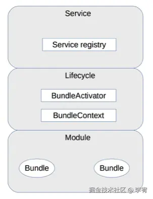 - 模块层(Module Layer):实现插件管理功能,插件称为Bundle,每个Bundle是一个Java的JAR文件,包含MANIFEST.MF元数据文件。
