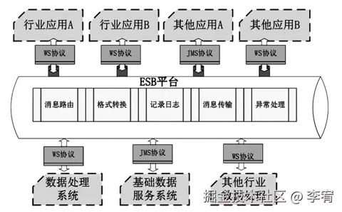 - ESB(企业服务总线):将各个异构系统连接在一起,实现服务间的高效互联互通。