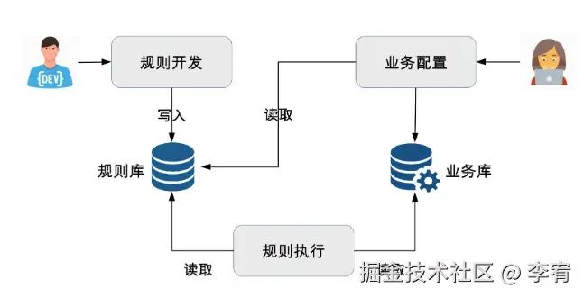 - 插件连接:规则引擎规定了规则开发的语言,业务人员基于规则语言编写规则文件。