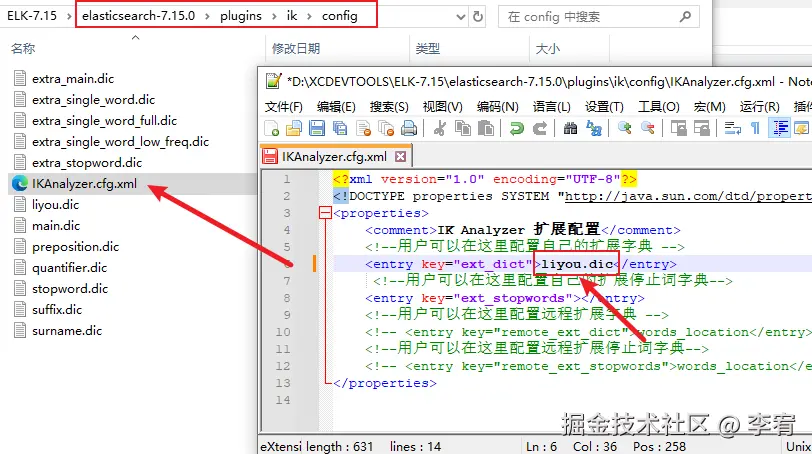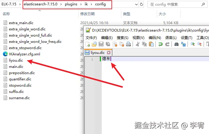 - 在 ik 插件的 config 文件夹中添加自己的分词文件 liyou.dic