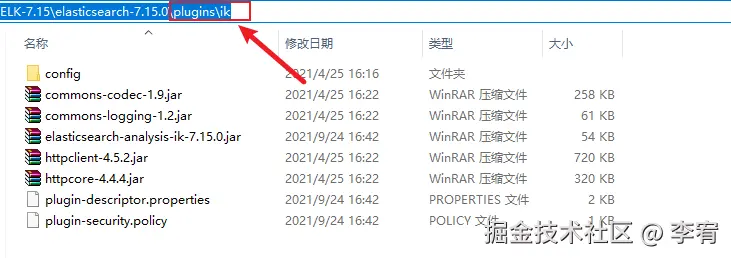 - 将下载的压缩包解压放到 es 的插件文件夹中,ik 分词器文件夹重新命名 ik