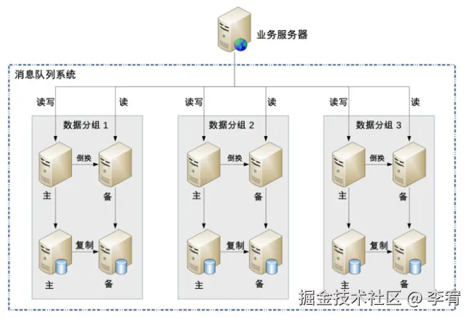 - 采用数据分散集群的架构,集群中的服务器进行分组,每个分组存储一部分消息数据,主备数据复制,分组间数据不同步。客户端采取轮询策略写入和读取消息。