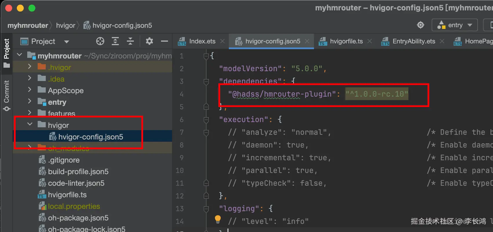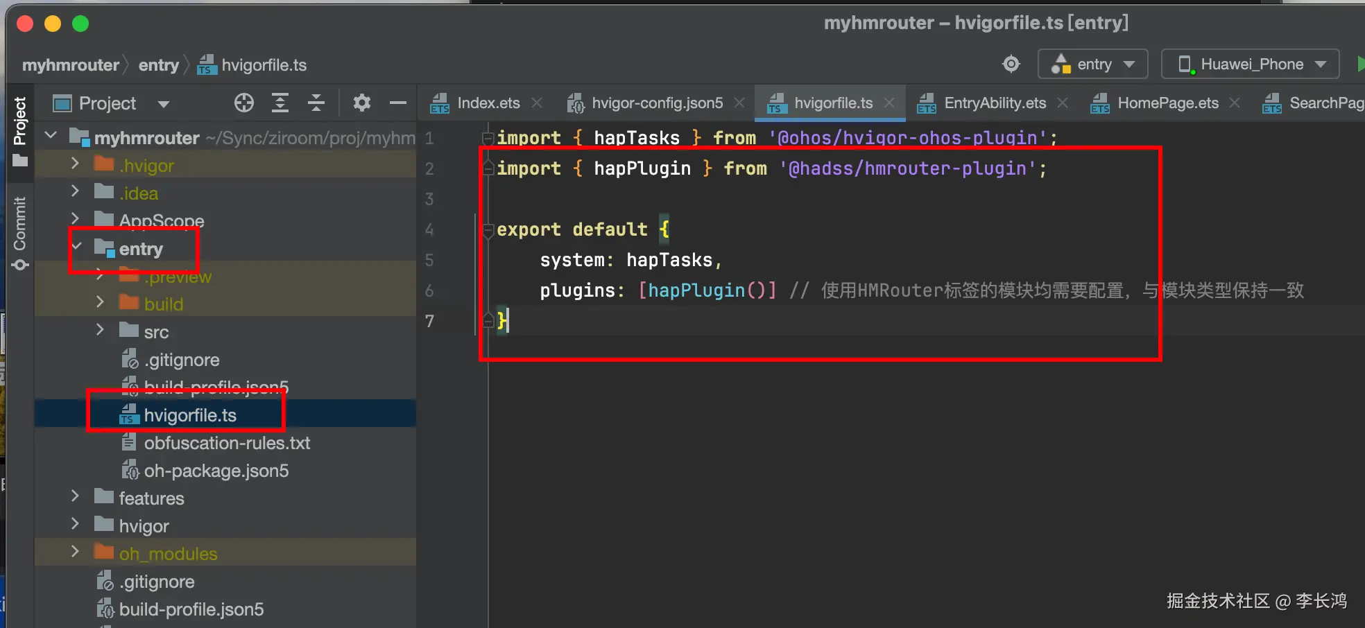 { "dependencies": { "@hadss/hmrouter-plugin": "^1.0.0-rc.10" }, } - 【配置】修改entry模块的hvigorfile.ts , 路径:entry/hvigorfile.ts