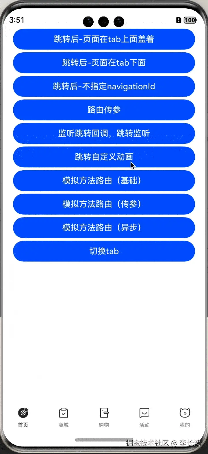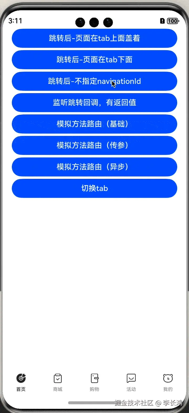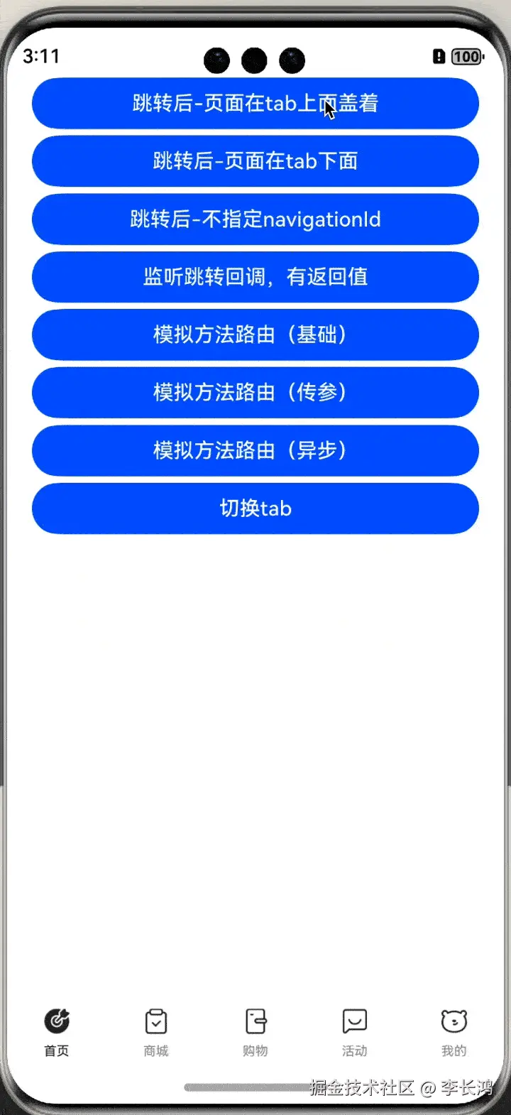 实现原理,app入口文件是Index,index中的HMNavigation指向AppPage,这一步是路由导航过去的,所以会执行路由拦截。tabs整体布局在AppPage中实现即可。