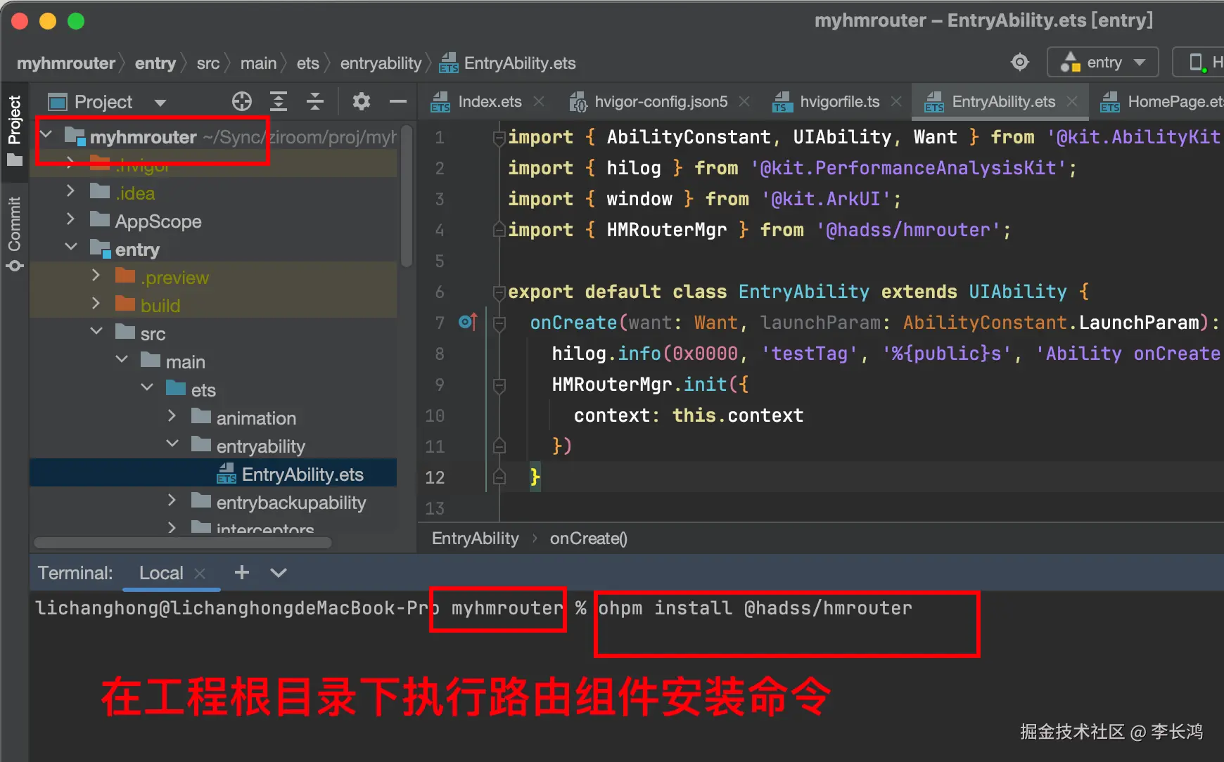- 【安装】在工程根目录下(壳工程下)安装hmrouter组件依赖,执行命令: