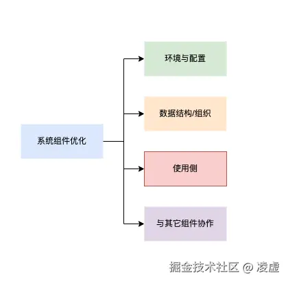 环境与配置:对组件的运行环境、组件的系统配置做优化。数据结构/组织:对在该组件中如何定义数据结构或组织数据的方向上思考优化。使用侧:作为该组件的客户端一侧,使用组件时做优化。与其它组件协作:该组件之外,与其它组件更好地协作完成系统整体性的优化。