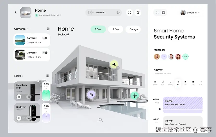 该智能家居仪表盘是为房屋或租赁网站设计的,除了直观的图表和图形,它还融入了3D风格的图像,进一步增强了用户的沉浸式体验。其简洁清新的风格,非常适合我们学习。