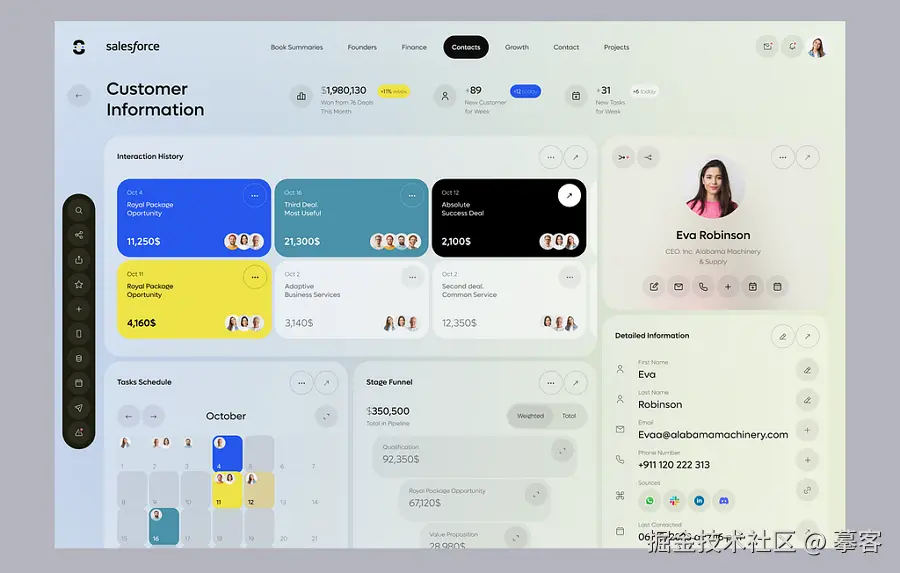 CRM系统中,最重要的就是仪表盘设计。下面这个CRM仪表盘设计得很成功,它采用了清晰直观的导航栏,方便用户快速操作,同时巧妙地运营多种卡片模块,将仪表盘划分为不同的功能区域。鲜艳的配色则用于突出关键数据,让重要信息更加醒目、一目了然。