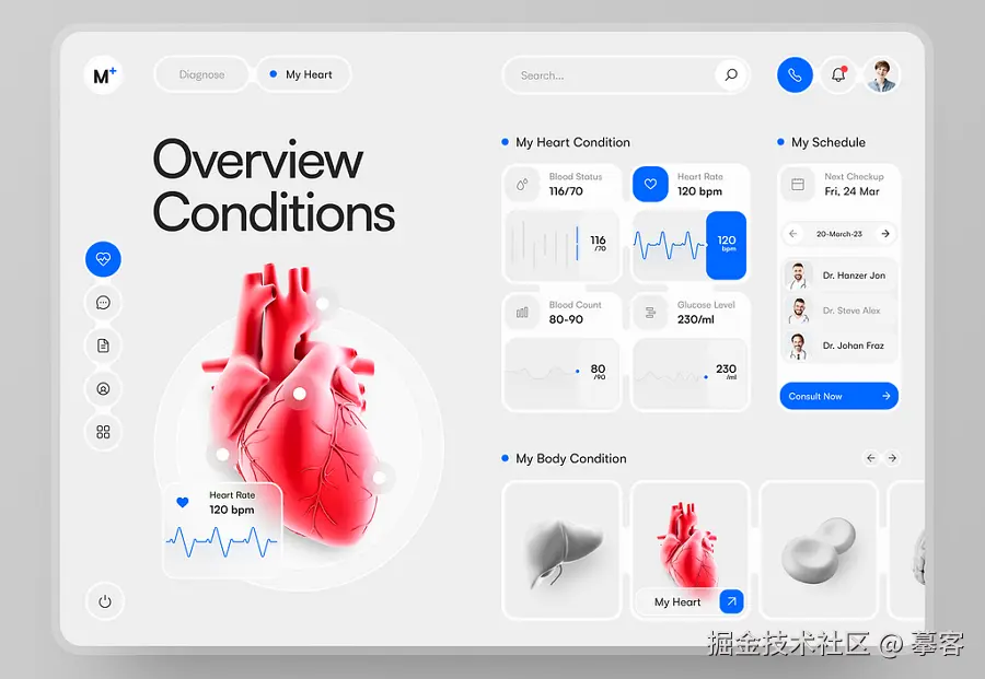 医疗保健领域,也常常会用到仪表盘,用于展示用户的身体数据,分析健康状况。下面这个仪表盘就是一个优秀示例,首页通过多种卡片设计,直观展示了多项身体数据。简洁的图标导航栏、便捷的顶部搜索栏以及可交互的器官图像,大幅提升了用户体验,让用户在浏览界面时,能够轻松地获取并分析数据。