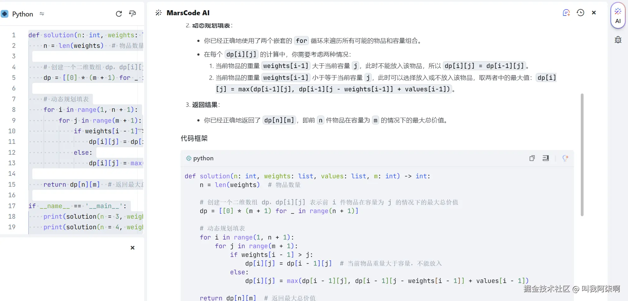 为了印证自己的解题思路是否正确,我使用AI助手提供背包算法的解题思路: