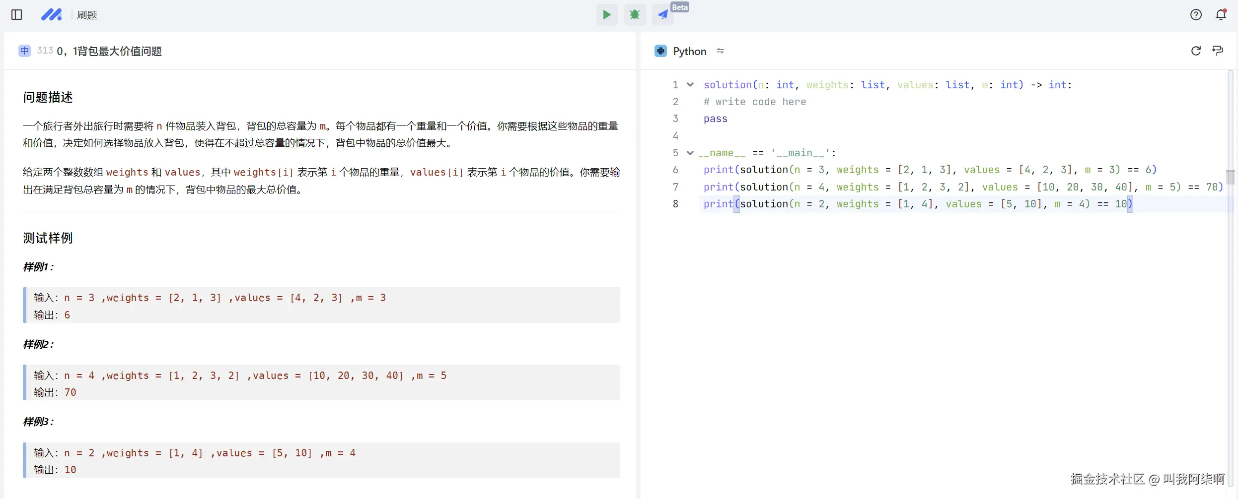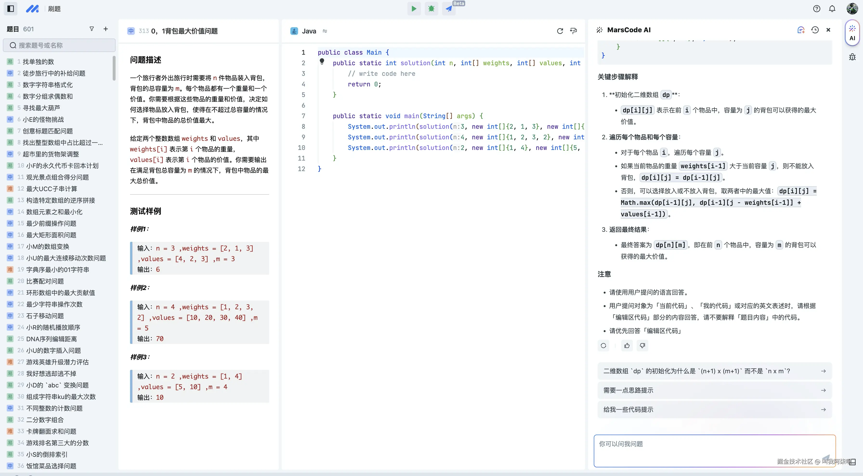 当初在参加蓝桥杯的时候,动态规划的背包算法给我的印象还是非常深刻的,当时还搜集了好久的学习资料。现在就看在marscode平台去深度学习背包算法。