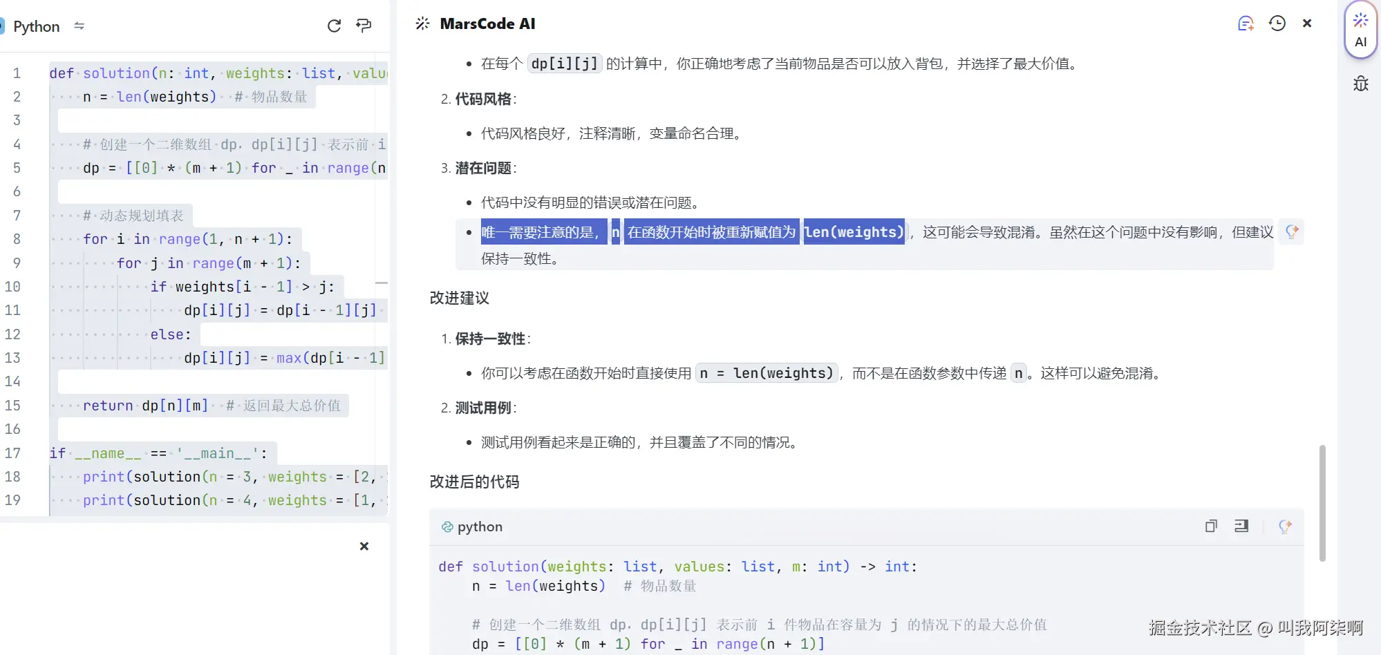 并且使用AI助手对我的代码进行了检查,并指出了我代码中潜在的问题,并给除了改进建议和代码。