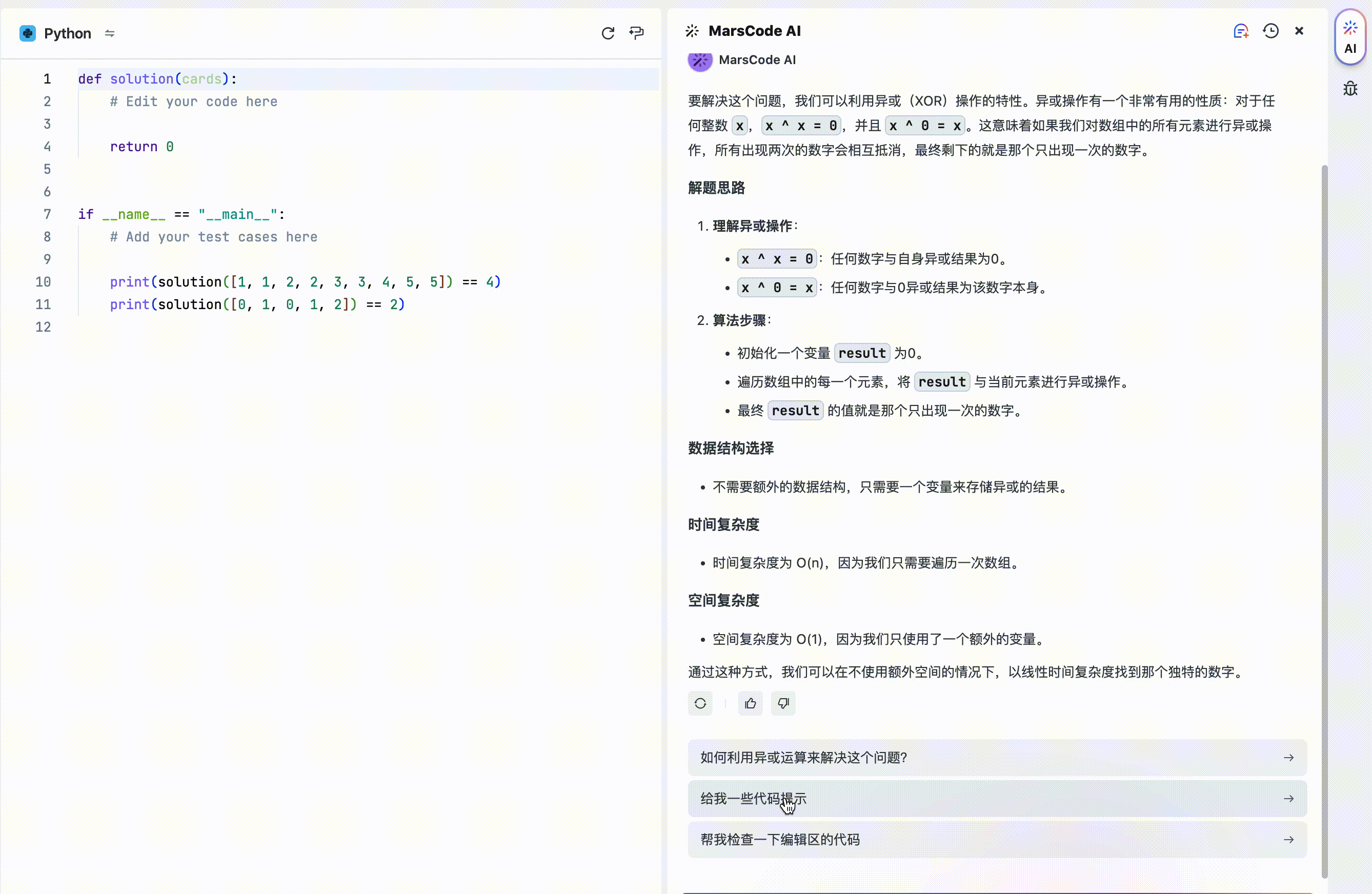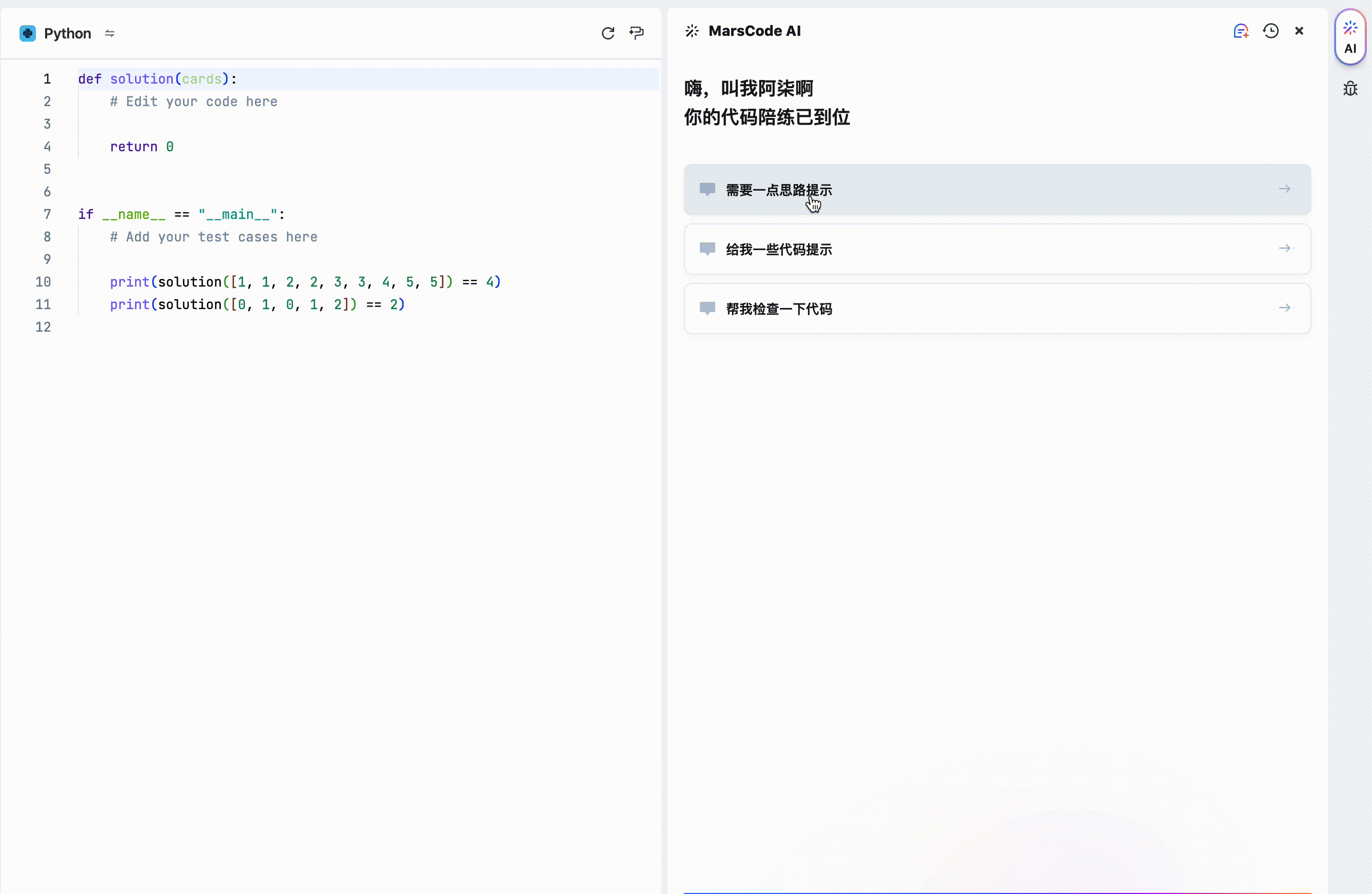 在marscode 做题平台了内置了AI助手,当我们做题没有思路时,就可以让AI助手给我们一些思路提示。