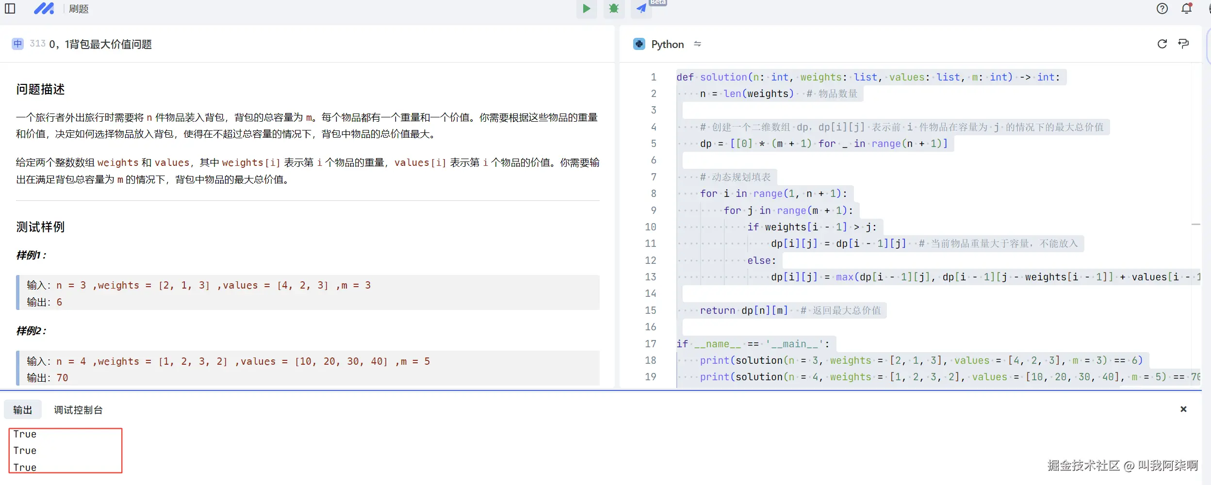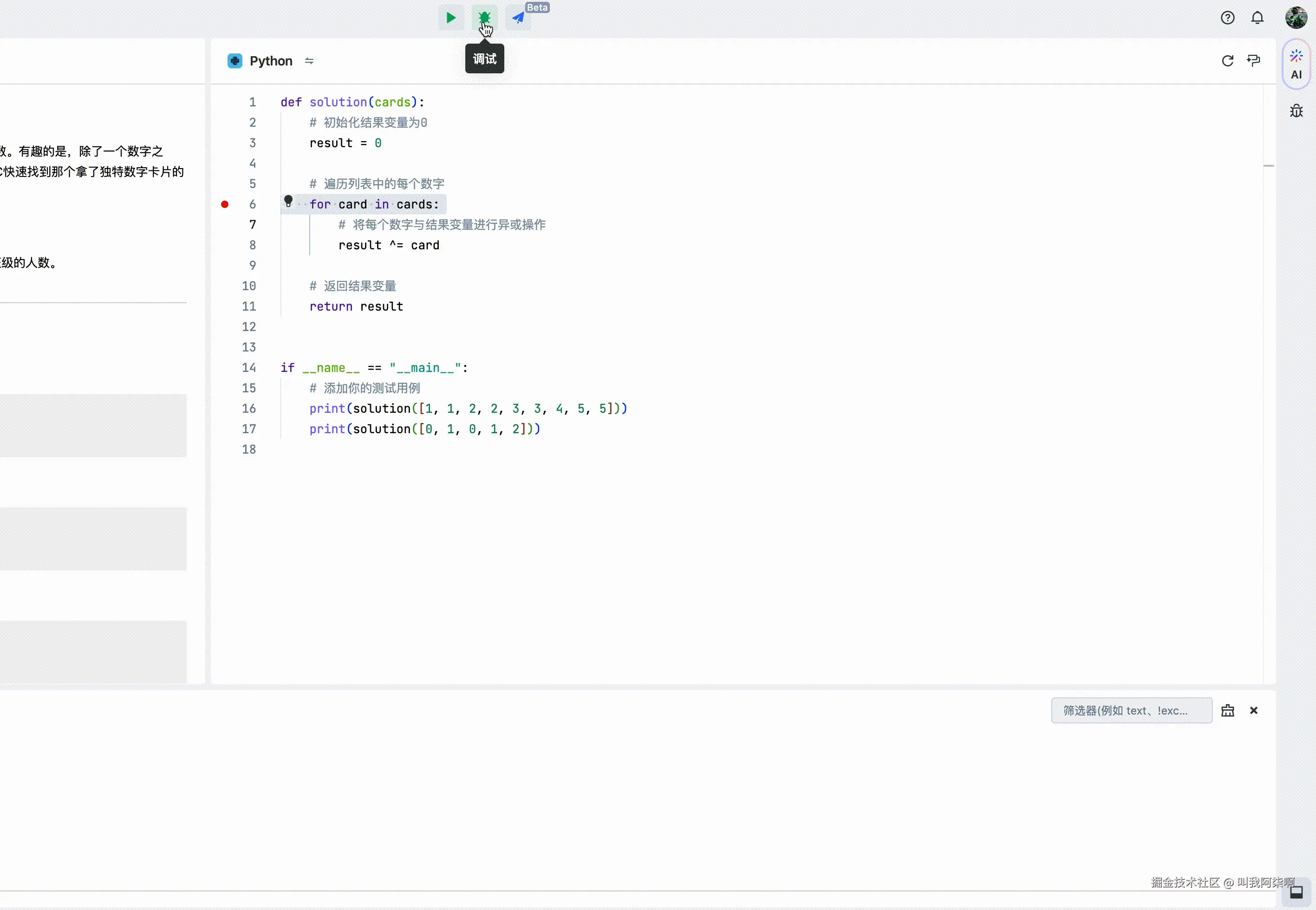 如图,在写完算法逻辑之后,根据题干中给的测试用例数据,点击运行。如果输出达不到预期,我们可以使用debug,对每一步代码进行问题排查。