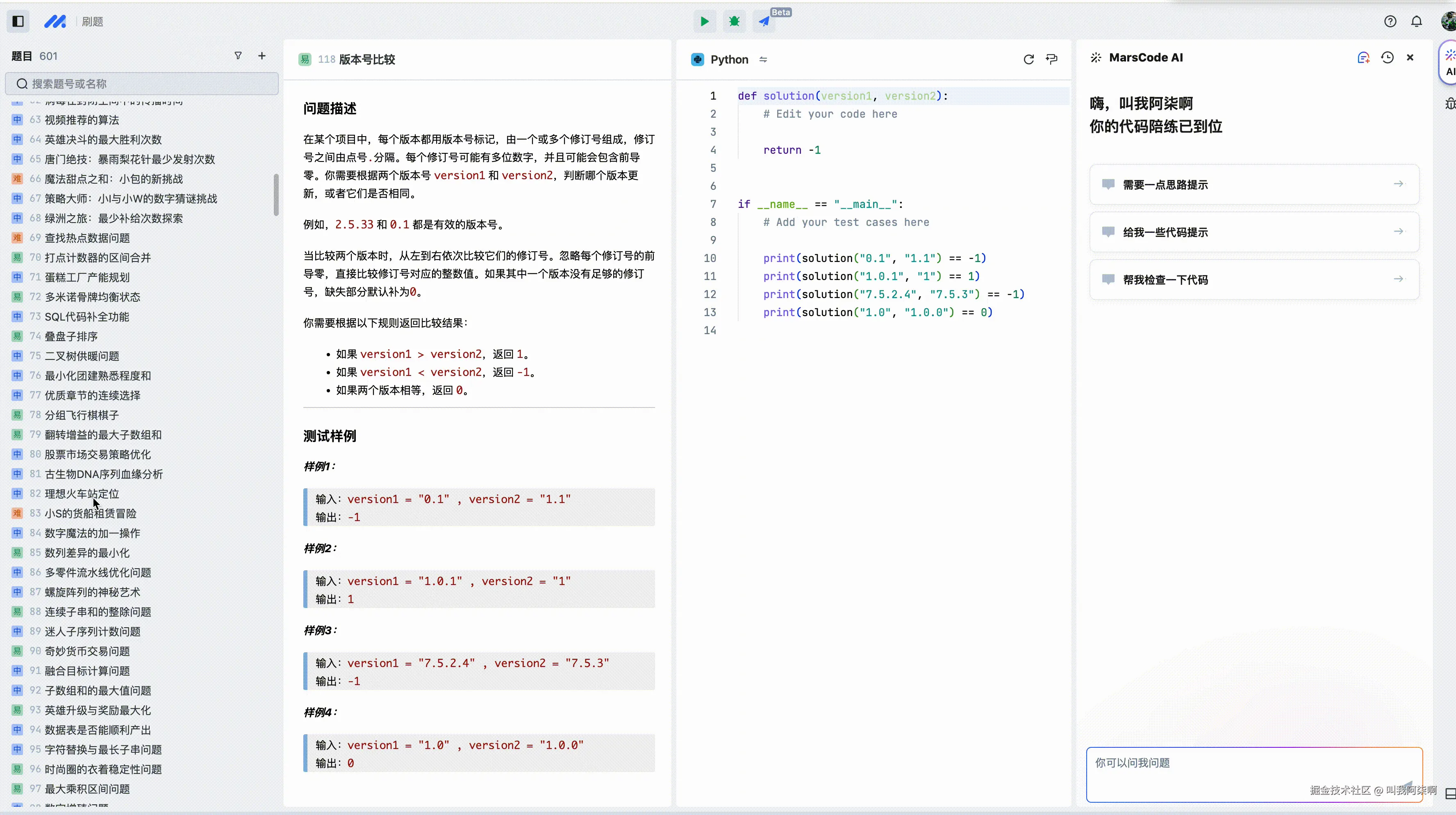 所以,找一个题库合理、刷题和题目答案深度解析集合的平台,就成了刷题人的首要目标。最近在研究marscode AI编程助手的时候,无意中发现MarsCode居然也开放了刷题平台。