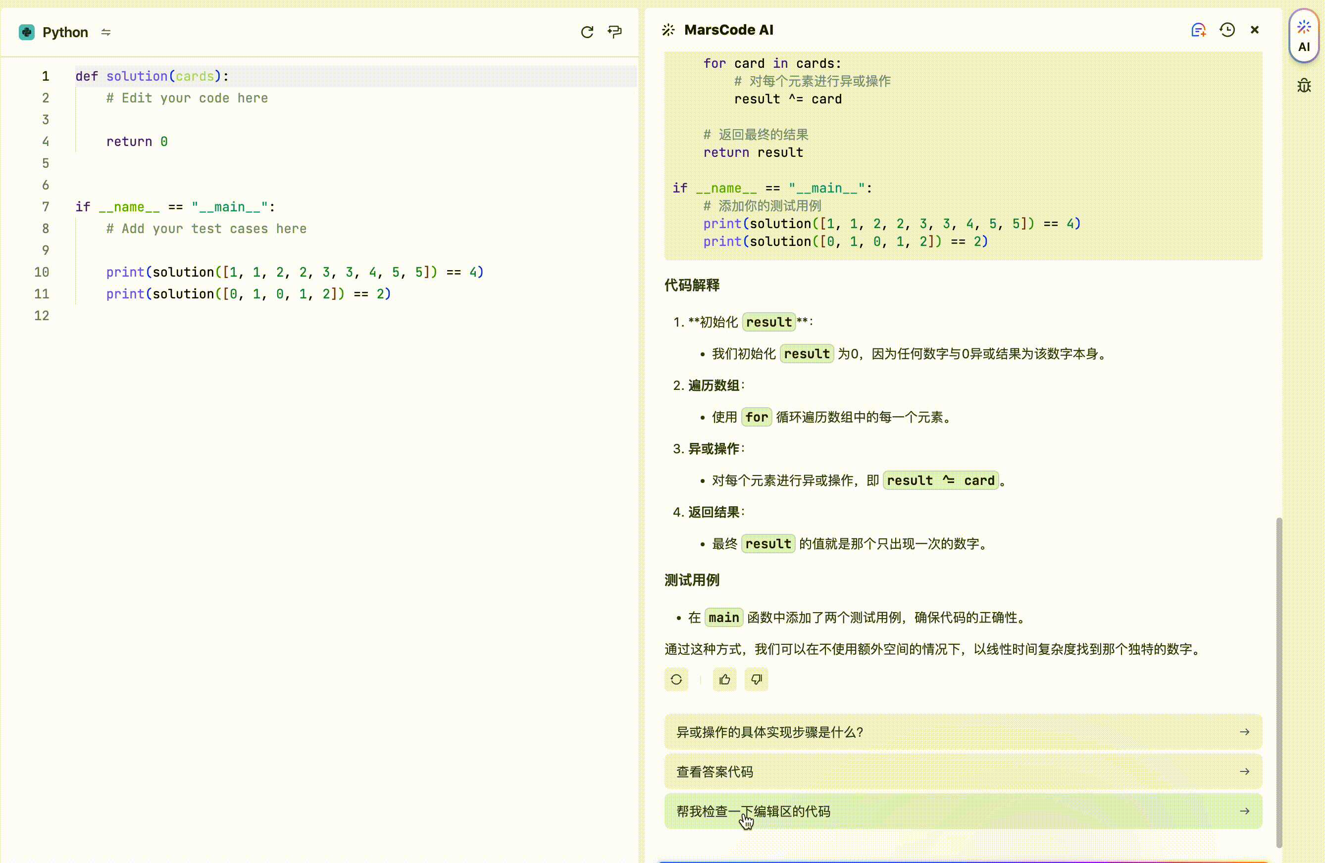 在我们写完代码之后,如果觉得代码拿捏不准的话,可以使用检查编辑区代码的功能,AI助手就会自动检查编辑区的代码,并给出修改建议。