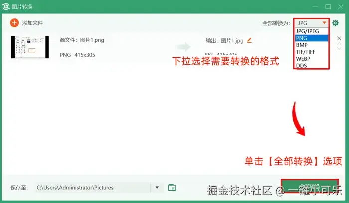 步骤3:在图片格式转换界面上,点击界面右上角的格式选择项,下拉选择需要转换的格式,然后点击右下角的【全部转换】即可。
