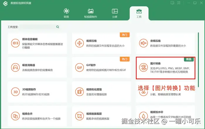 步骤1:打开数据 蛙视频转换器,选择【工具】选项下的【图片转换】功能。