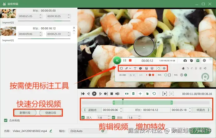 步骤3: 在录制的过程中,还可以使用软件自带的标注工具对视频进行标注。在录制结束后,可以使用 “高级剪辑” 工具对视频进行后期编辑操作,如快速分段视频、剪辑视频片段等。