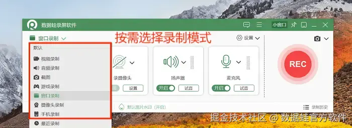 步骤1: 打开数据 蛙录屏软件,在软件内选择需要的录制模式。软件内置了视频录制、游戏录制、窗口录制等多种录制模式,本文以 “视频录制” 为例。